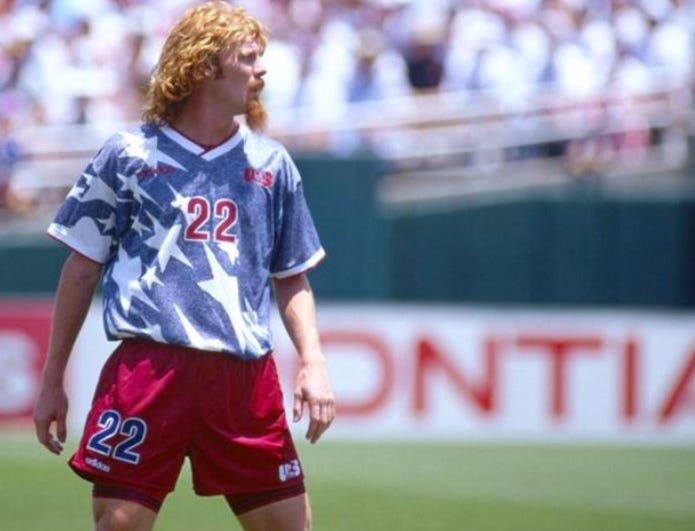 The majority of their games were played wearing what was originally meant to be their away kit but actually became one of the most iconic World Cup shirts of all time. A mottled blue background was the perfect vessel for the slanted white stars to stand out and the red trim completed the ensemble perfectly. With his wild red hair and goatee beard, Alexei Lalas was a hugely memorable presence in the kit and became an instant icon of the world game.