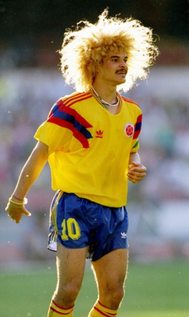 Thoughts immediately flood back to Carlos Valderrama’s huge afro of blond ringlets, thick moustache and wrists adorned with bracelets gliding around the midfield looking for spaces and teammates to pass to. Colombia’s traditional yellow shirt was punctuated by bold red and blue slashes on the shoulders while the neat red trim around the collar and arms perfectly complemented the traditional three stripes down the arms.